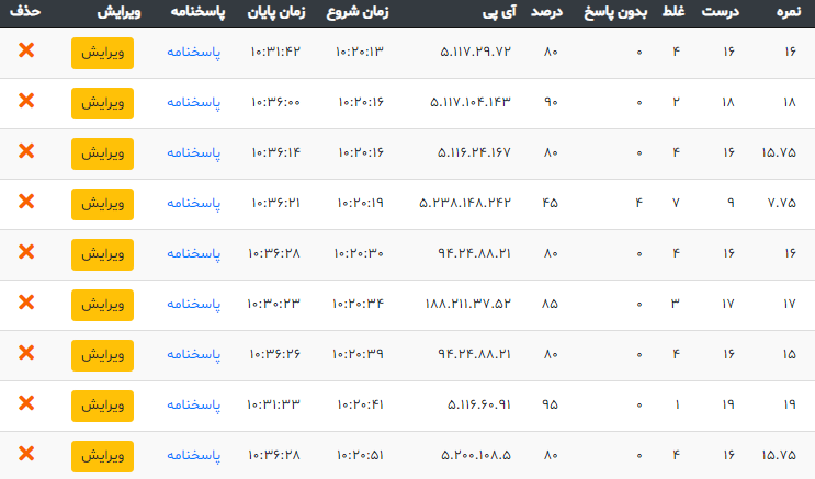 در قسمت نتایج می توانید اطلاعاتی کاملی از جلمه نام کلاس، کد دانش آموزی، نمره، تعداد درست، تعداد غلط، تعداد بی پاسخ، درصد، آی پی دانش آموز، زمان شروع، زمان پایان و پاسخنامه دانش آموزان را مشاهده کنید. نمرات دانش آموزان را ویرایش کنید اطلاعات بر اساس ستون مورد نظر مرتب کنید. جستجو کنید و خروجی اکسل بگیرید و یا چاپ کنید