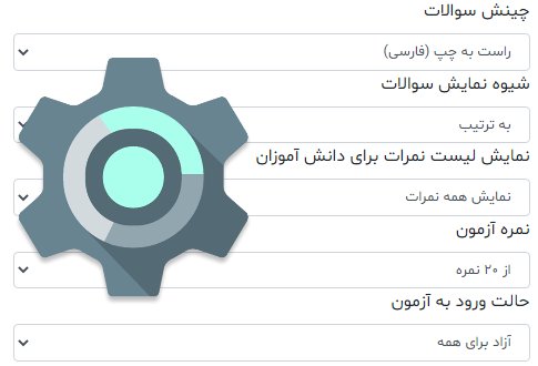 درقسمت تنظیمات آزمون به مواردی همچون نحوه چینش سوالات راست به چپ برای آزمون های فارسی و چپ به راست برای آزمون های انگلیسی، شیوه نمایش سوالات برای دانش آموزان، تعیین نمایش نتیجه آزمون برای دانش آموزان، تعیین نمره آزمون، تعیین حالت ورود به آزمون، نمایش پاسخنامه، جلوگیری از دوبار امتحان دادن براساس آی پی، جلوگیری از دوبار امتحان دادن براساس مرورگر دسترسی خواهید داشت.